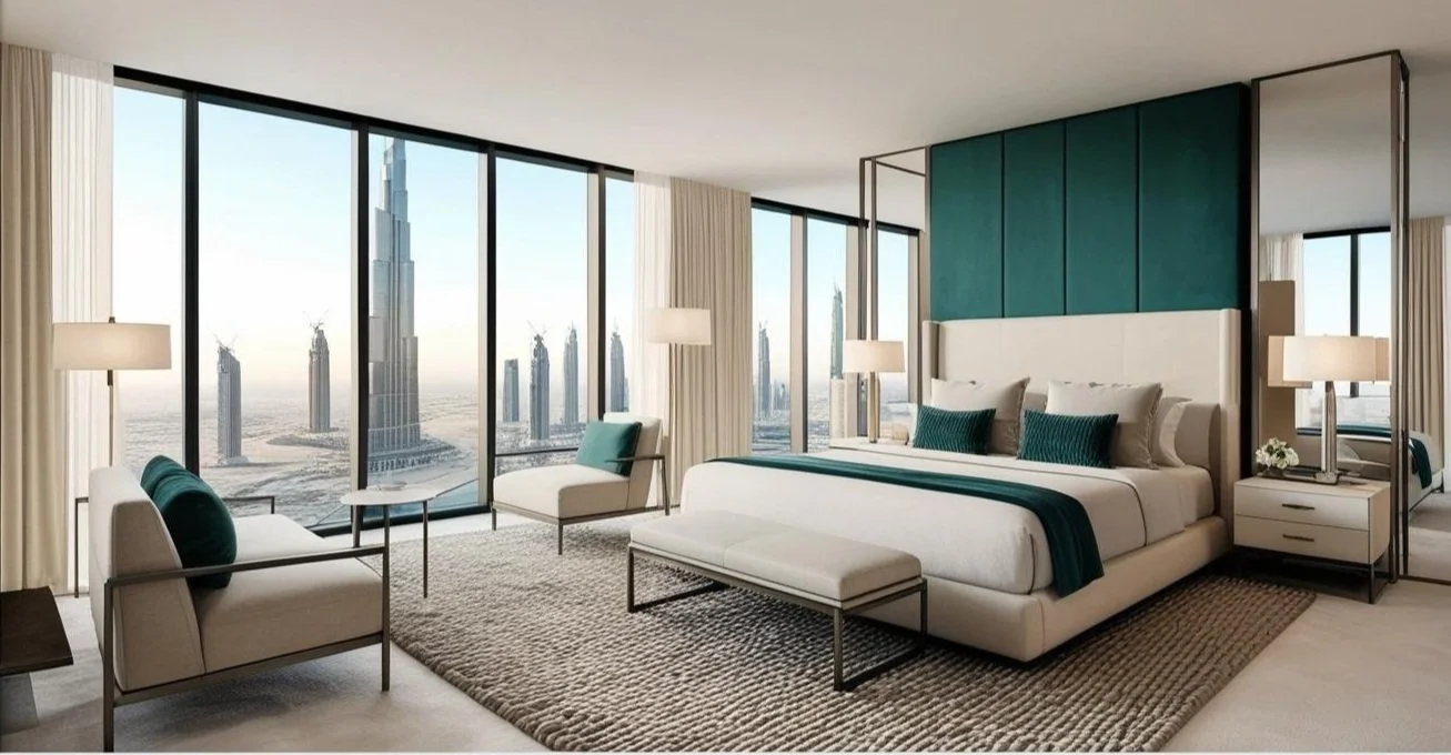 The master bedroom suite in this contemporary-style penthouse in Dubai is a harmonious blend of elegance and tranquility, characterized by its muted color palette that creates a serene oasis in the bustling city. As you enter the suite, you are greeted by an expansive open space bathed in natural light, courtesy of floor-to-ceiling windows that offer breathtaking views of the Dubai skyline. The walls are painted in soft shades of warm greys and off-whites, providing a calming backdrop that enhances the room’s spaciousness.